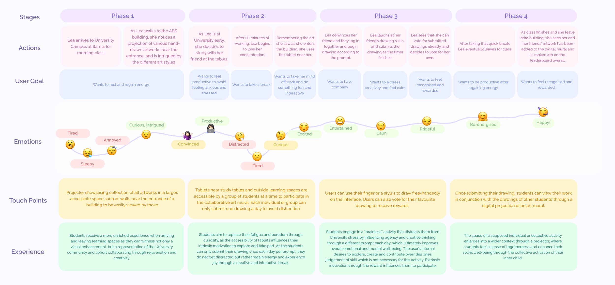 By integrating playful and creative engagement within these spaces, we developed Campus Canvas to redefine how students interact with their environment. It promotes emotional well-being, encourages rest, and transforms university spaces into areas that support both productivity and personal balance.