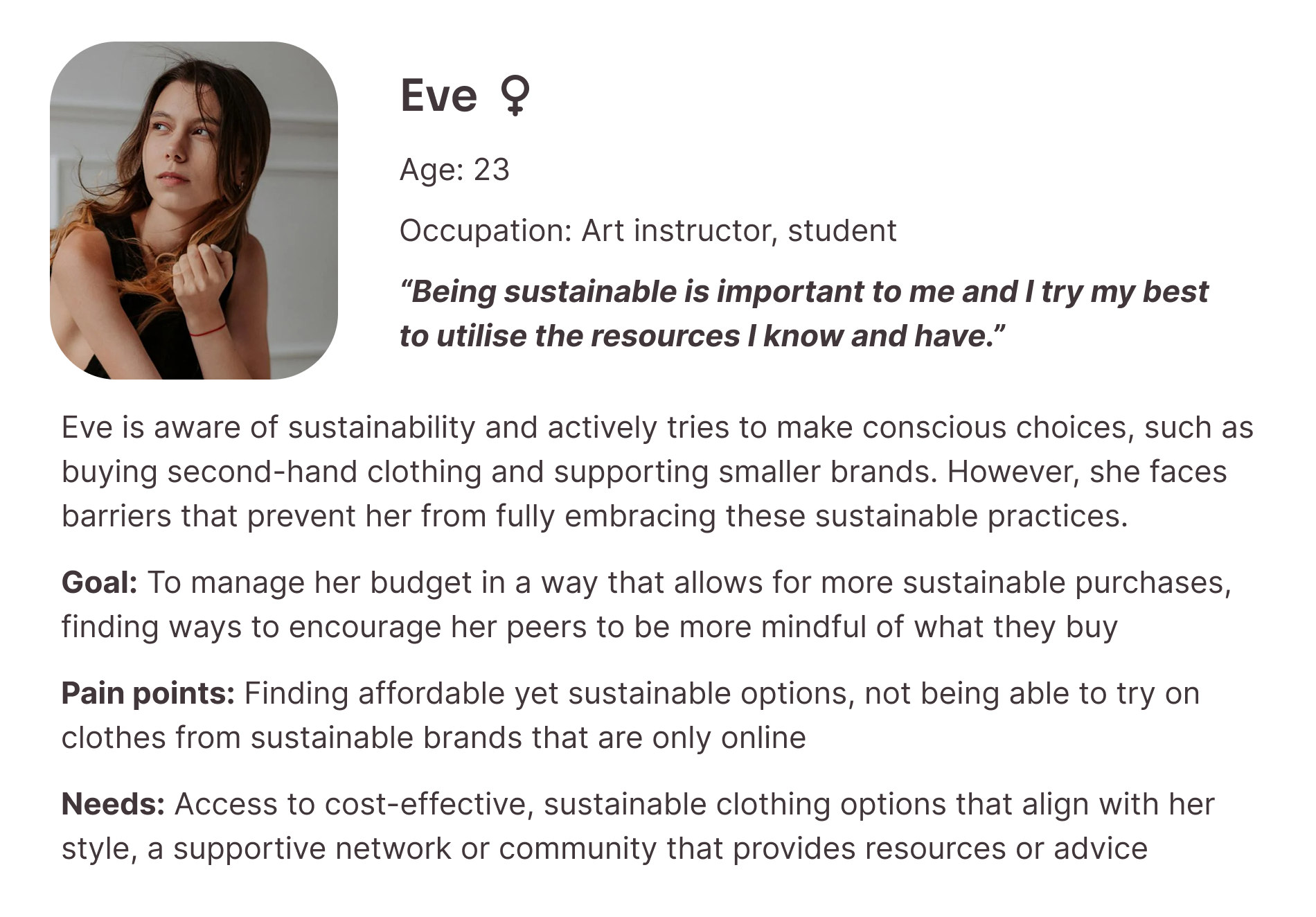 After refining our problem statement to accurately reflect the key insights gained from our research, we developed 3 key personas that represented the diversity of our target audience and allowed us to understand the range of needs that must be catered to. The personas are differentiated by their perspectives, attitudes, and approaches to sustainability, particularly in how it influences their daily routines.
