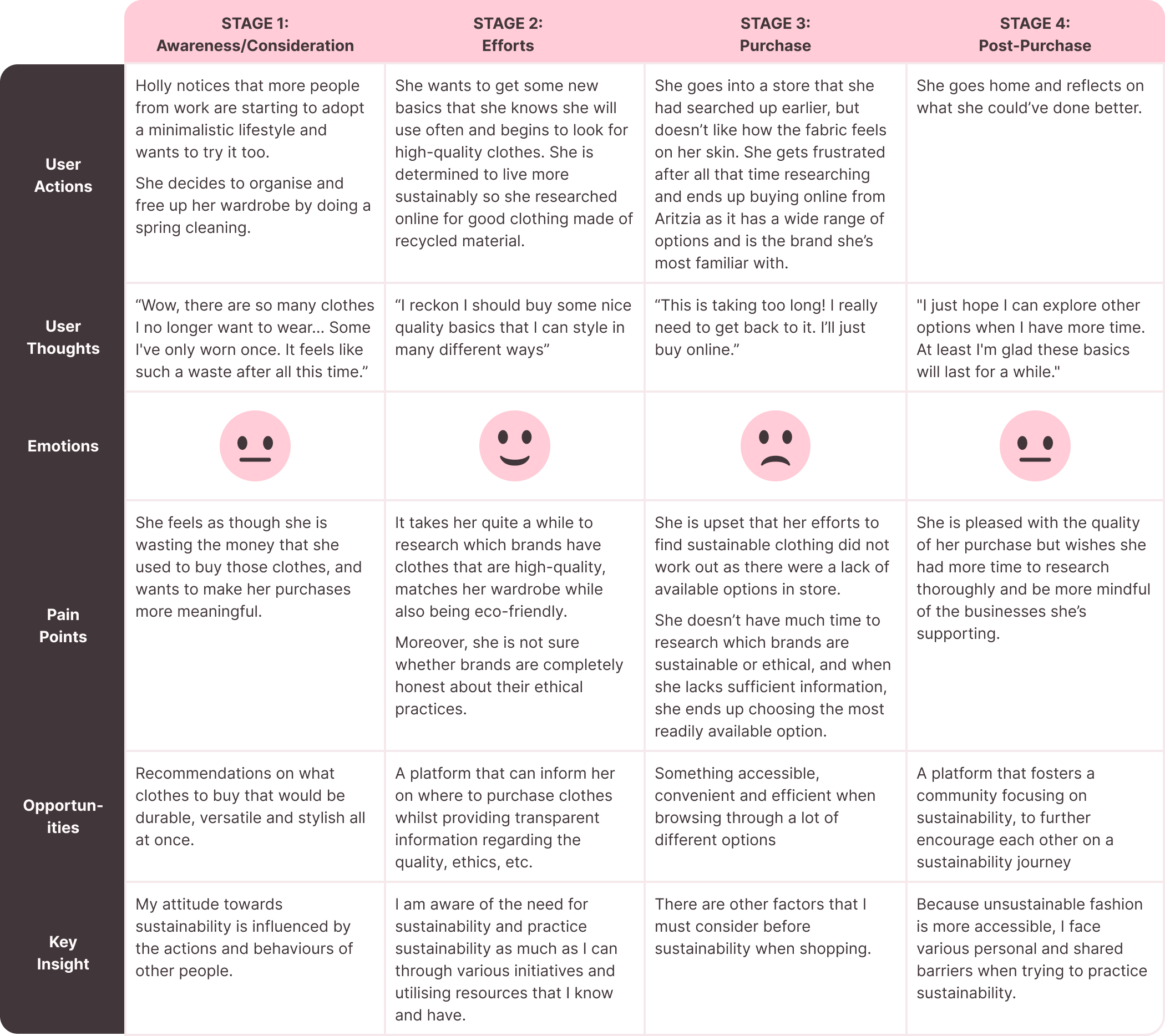 When addressing our problem area, we focused on our persona, Holly, to guide our concepts and direction. Her experience was further synthesised and visualised in a user journey map.