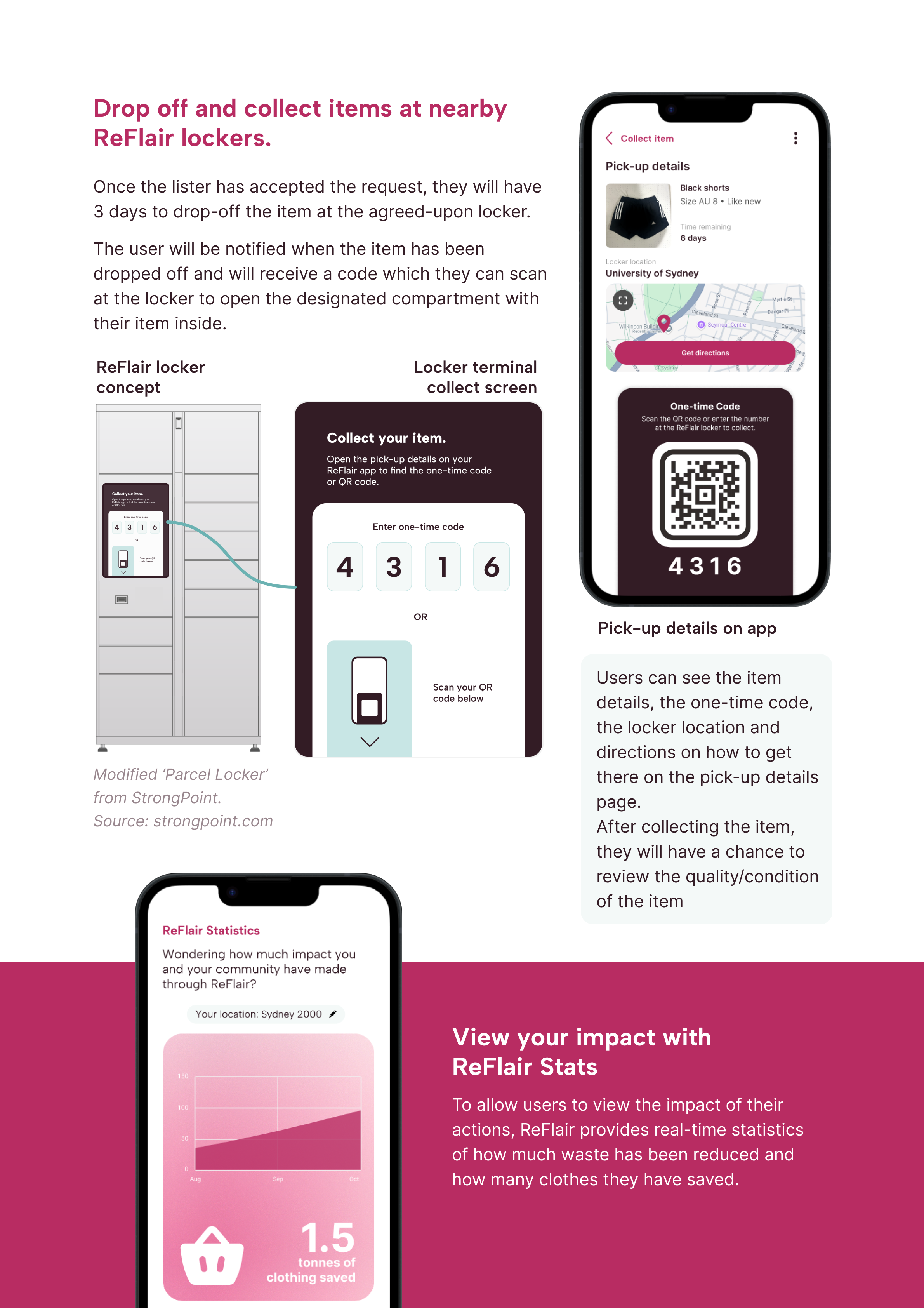ReFlair is a community-driven clothing exchange platform that makes sustainable fashion accessible through a collect-and-drop-off locker system. By connecting individuals who want to give away clothing—ranging from second-hand to like-new items—with those looking to receive them, ReFlair encourages circular fashion consumption. This process is seamlessly automated through an interconnected mobile app and locker system, offering a convenient and simple way for users to participate in sustainability.