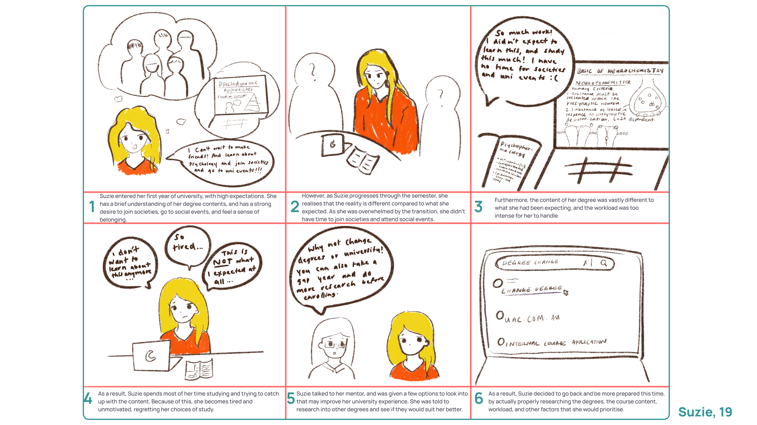 The transition from high school to university is a life-changing time as students must learn to manage their time and effort independently. While some students successfully adjust to university life, many students do not, often resulting in attrition from the university and mental health issues. Our team decided to focus on this area by designing a platform that enhances student support and fosters a sense of belonging. We recognised that access to shared experiences, guidance, and university resources could help ease the transition, ultimately improving student retention and well-being.
